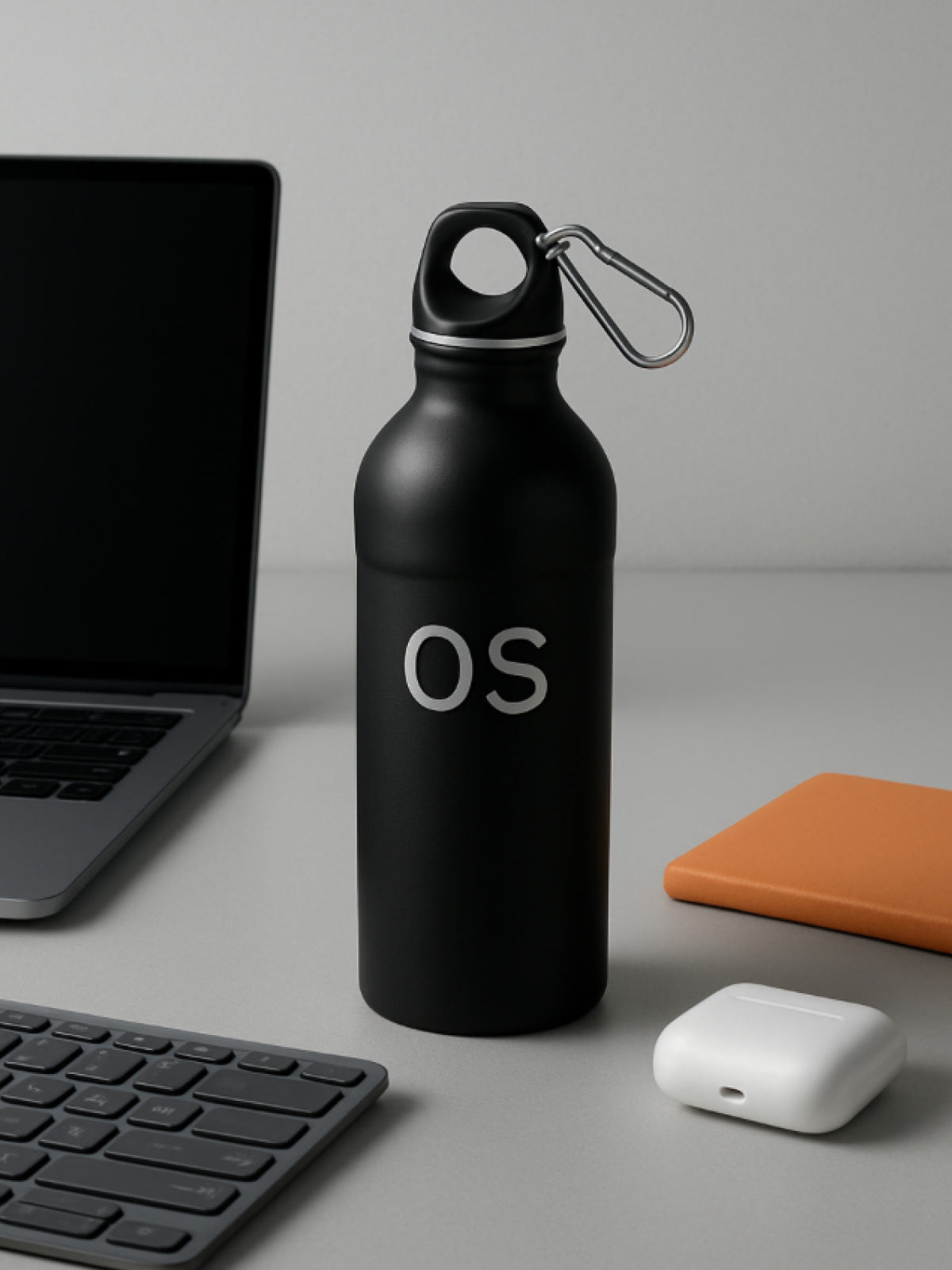 Reusable 500ml metallic bottle with OS print. Insulated sleeve keeps drinks cold/warm; sustainable for daily hydration.
